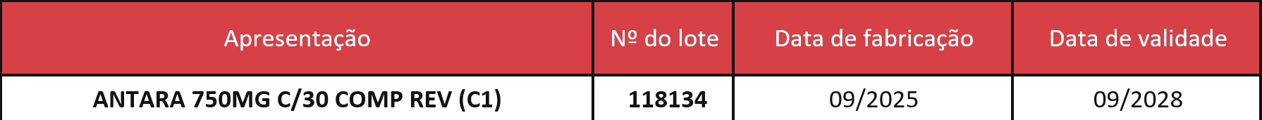 A empresa Distribuidora de Medicamentos SantaCruz Ltda vem, por meio deste, comunicar que por determinação do fornecedor EUROFARMA, efetuará o recolhimento voluntário do produto ANTARA 750MG C/30 COMP REV (C1) – Lote: