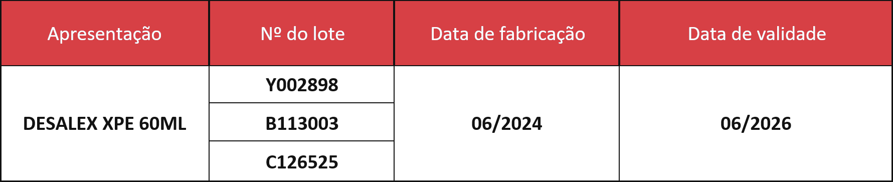 A empresa Distribuidora de Medicamentos SantaCruz Ltda vem, por meio deste, comunicar que por determinação do fornecedor SUPERA, efetuará o recolhimento voluntário do produto DESALEX XPE 60ML  – Lote: