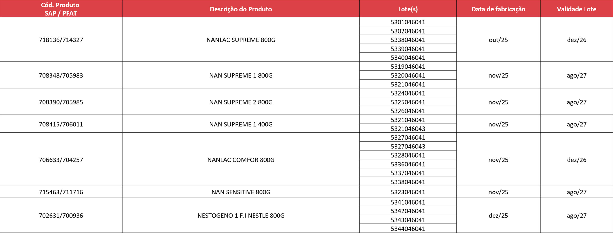 Nestlé Brasil informa que, como parte de seus controles de qualidade, identificou uma possível inconformidade em um ingrediente de fornecedor, utilizado em lotes específicos de alguns produtos de nutrição infantil. Não há registro de eventos adversos no Brasil. Ainda assim, por precaução, a Nestlé está adotando uma medida voluntária e preventiva, realizando o recolhimento imediato dos lotes potencialmente afetados.